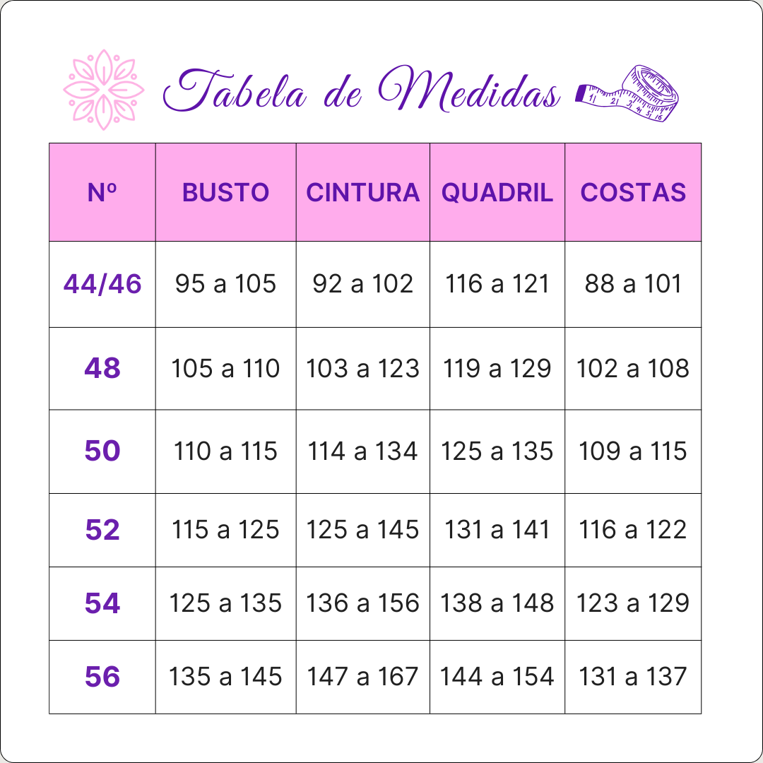 Use nossa tabela de medidas, mas sempre estamos à disposição pelo Whatsapp para qualquer esclarecimento.